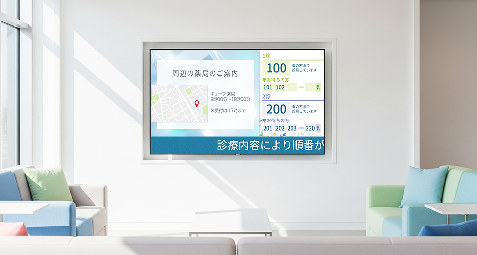 例えば、画像スライドショーや、BRAVIAテレビと連携した院内表示では、呼び出し状況やお知らせとともに、映像コンテンツを同時に表示することで、待ち時間をただの"空白"ではなく、安心して過ごせる時間へと変えていきます。